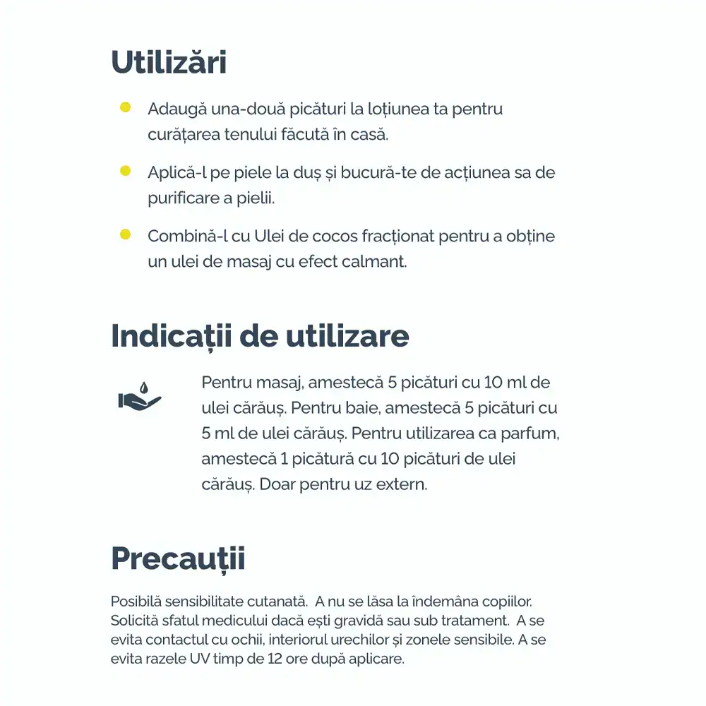 Pentru piele sensibilă: Amestecă întotdeauna cu ulei purtător (cocos, migdale dulci) – nu aplica direct pe piele.