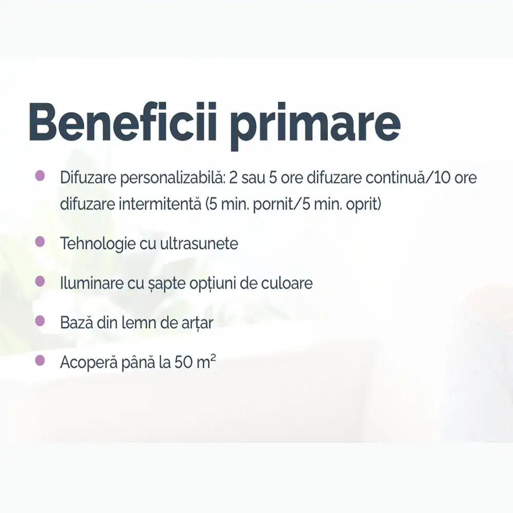 - Tehnologie ultrasonică (ceață rece, zero căldură, zero zgomot >30dB)