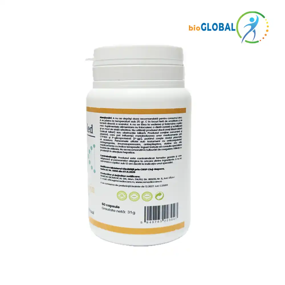 | Piperină | 5 mg | Alcaloid natural din piperul negru. Crește biodisponibilitatea curcuminei de 10 ori prin inhibarea metabolizării și creșterea permeabilității intestinale. Fără piperină, curcumina ar fi absorbită foarte slab. |
