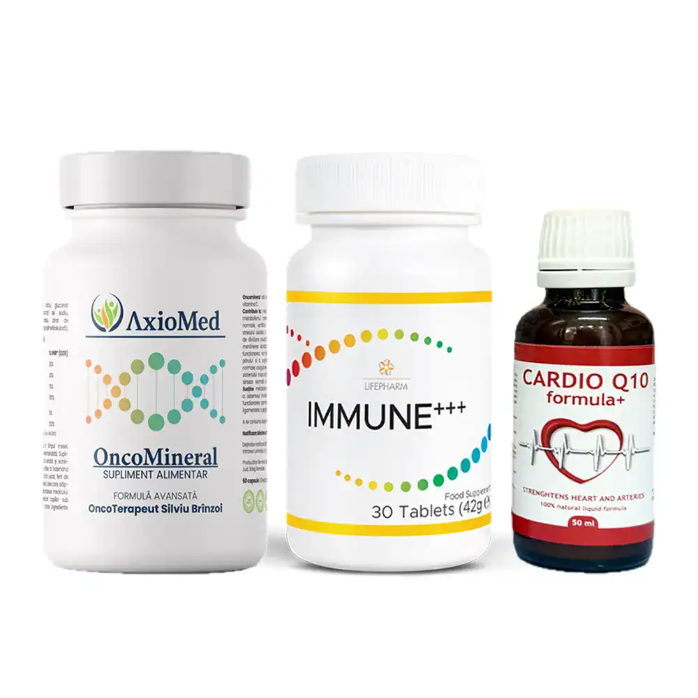 Pachet antitumoral bioGLOBAL.ro ce conține 1 OncoMineral AxioMed, 1 Immune+++ LifePharm, 1 Cardio Q10 gratuit
