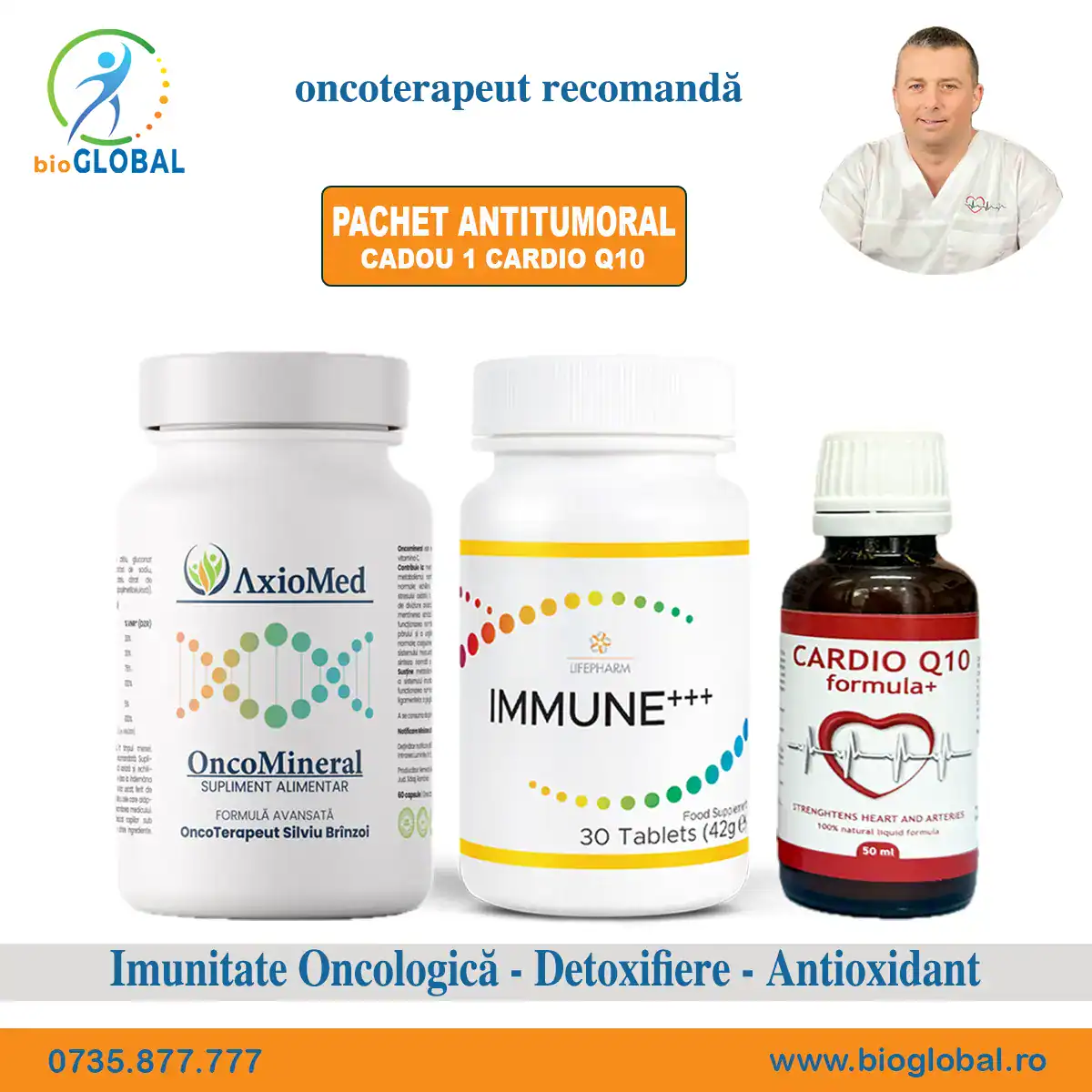 Pachetul Antitumoral BioGlobal este o combinație strategică de 3 suplimente premium, dezvoltată pentru a oferi protecție oncologică completă și susținerea organismului în perioada de risc sau ca adjuvant în tratamentele existente. Formula este recomandată de oncoterapeutul Silviu Brînzoi, cu o experiență de peste 15 ani în medicina integrativă, acordă suport medical pe parcursul terapiilor. Acesta a creat miraculosul remediu anticancer OncoMineral AxioMed.
