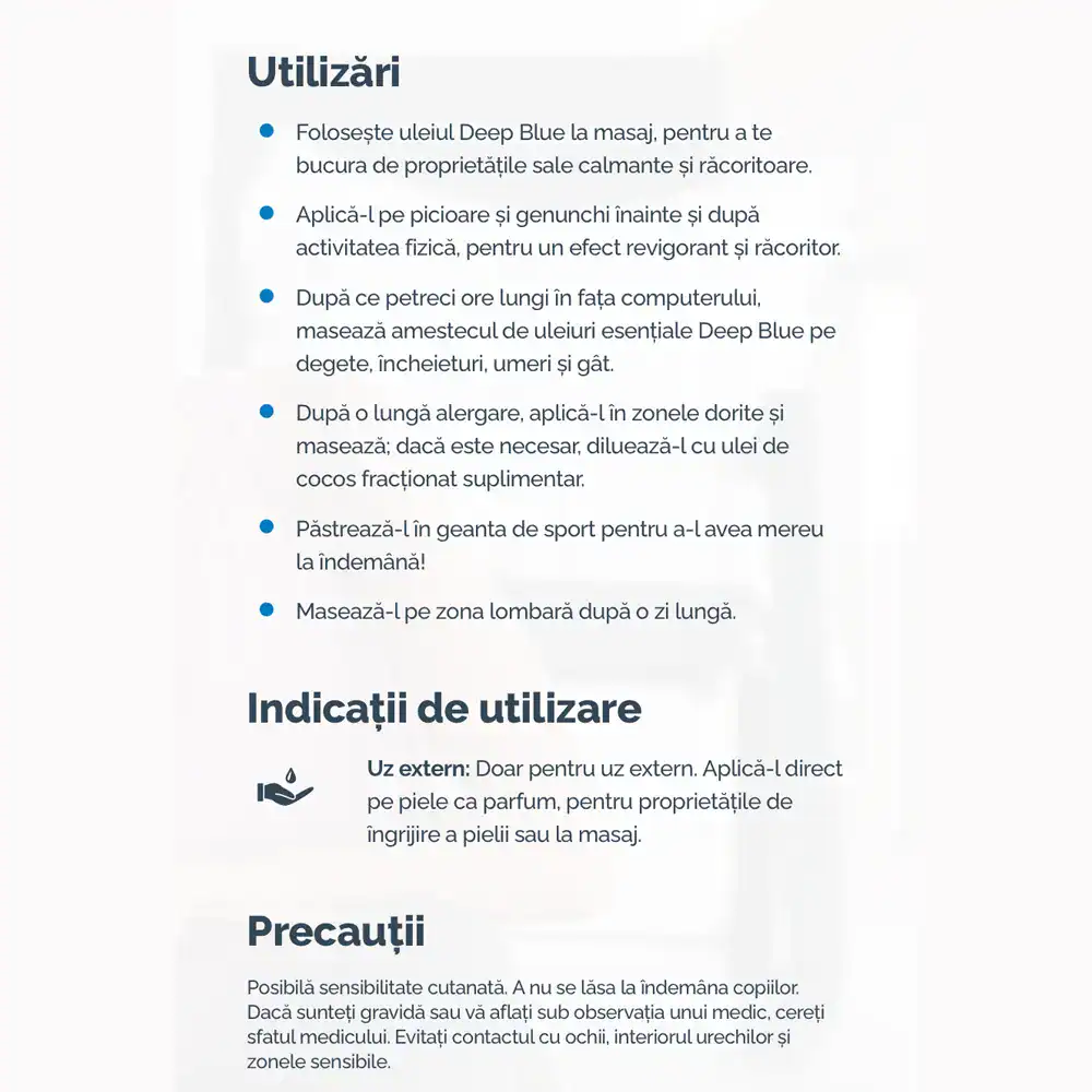 Pre-diluat în ulei de cocos fracționat pentru protecția optimă a pielii sensibile, Deep Blue Touch oferă aceeași putere calmantă ca versiunea concentrată, dar într-o formulă gentilă care poate fi folosită de întreaga familie, inclusiv copii și persoane cu pielea delicată – fără grija iritațiilor sau senzațiilor prea intense.