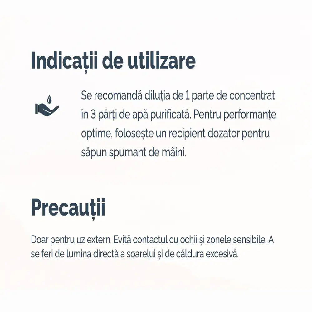 Doar pentru uz extern. Evită contactul cu ochii și pielea iritată. În caz de contact accidental cu ochii, clătește abundent cu apă. Păstrează într-un loc răcoros și uscat, departe de razele directe ale soarelui și la îndemâna copiilor.
